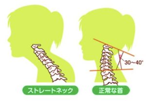 最近非常に多くの人で見られるようになってきている「ストレートネック」とはどのような状態なのでしょうか?理想的な首の骨のカーブの形状は横から見た際、前に向かって凸の状態(上の図の右側)が理想です。しかし「ストレートネック」の人の首の形状はこのカーブが無く、まっすぐ(上の図の左側)になってしまっています。