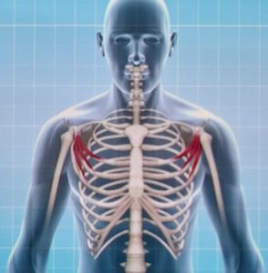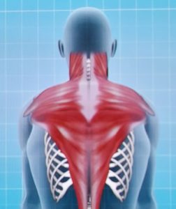 人の頭の重さは8kg前後あり、ボーリングの玉ぐらいの重さを想像してみてください。最近ではテレビゲームや、PCを使った作業、スマートフォンの普及などによって、常に頭が前に出た状態で長時間いることが増えてきています。それらによって首回りの筋肉だけでは無く、小胸筋(上の図の左側の赤色で示した筋肉)は短い状態で固くなり、僧帽筋(上の図の右側の赤色で示した筋肉)は長い状態で固くなることで、肩を前で固定してしまうことに繋がります。「ストレートネック」の人の多くは猫背を呈していることも非常に多いのも特徴です。