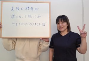 産後の骨盤のゆがみが気になっていたのと、元々、肩こり・腰痛があり悩んでいたので受診しました。