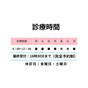 | 営業時間 | 【月・火・水・木・日】10:00~17:00(最終受付:16:30)完全予約制 |